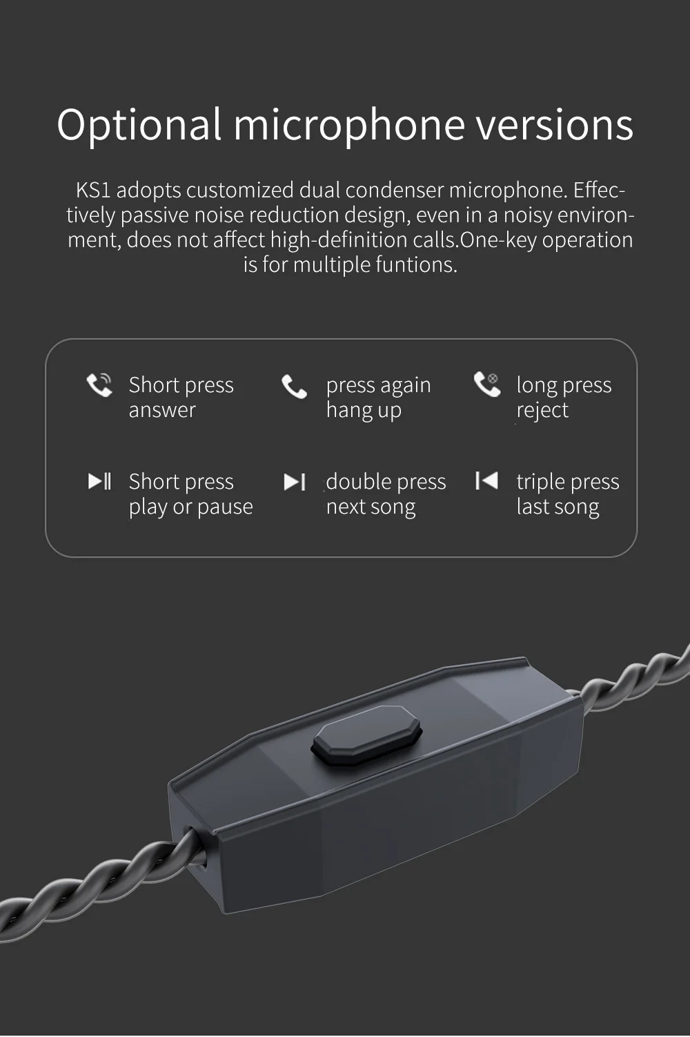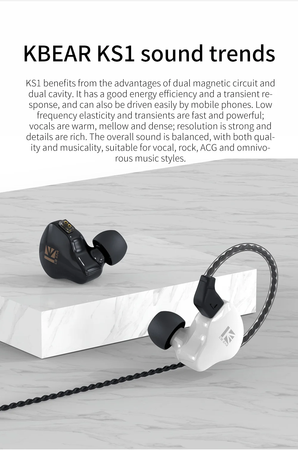 - Hi-Fi stereo:Â KS1Â adopts dual magnetic circuit single DD unit. The DD is added an independent rear sound cavity, which can quickly accumulate and compress air to increase power and details. It features a powerful low frequency response, mellow midrange performance, transparent high frequency, great vocal resolution, wide sound field, richer instrument details, and delicate music performance.